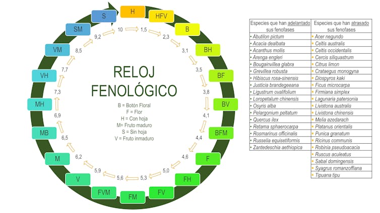 Modelo de reloj fenológico seguido para la observación de la fenología de 92 especies del Jardín Botánico Histórico de La Concepción (Málaga) en base a los datos tomados durante treinta años por Belén Verdú. A la derecha relación provisional de especies que manifiestan un adelanto o un retraso en el conjunto de sus fenofases o fases de su cliclo vital. Salvo-Tierra & Pérez-Massé (en preparación), CC BY-NC-ND