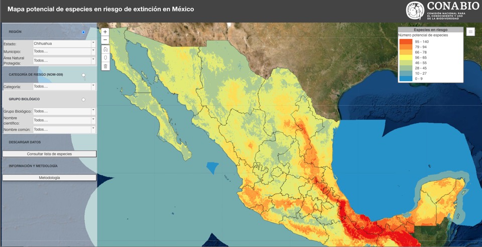 En este contexto, la Comisión Nacional para el Conocimiento y Uso de la Biodiversidad (Conabio) ha desarrollado la página de consulta Mapa de especies en riesgo de extinción en México, que permite ver por primera vez el mapa potencial de cerca de 950 especies en riesgo en México.